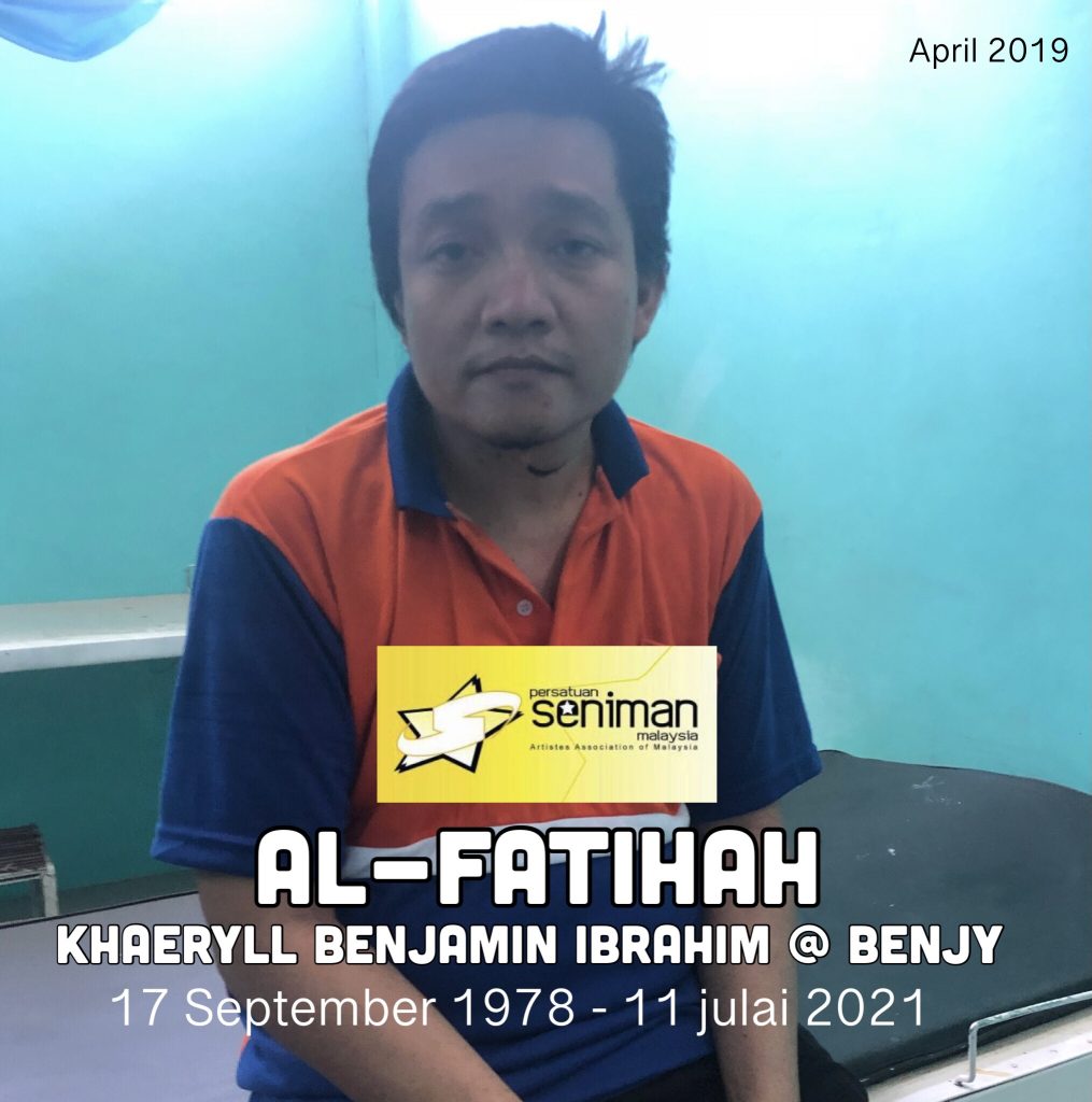 AHAD 11 JULAI, Persatuan Seniman Malaysia (SENIMAN), dukacita dimaklumkan bahawa Industri Kreatif kehilangan seorang lagi permata seni yang sangat berbakat iaitu arwahyarham Khaeryll Benjamin Ibrahim atau lebih dikenali sebagai Benjy yang juga anak Seniwati Negara arwahyarham Azean Irdawaty pada jam 11 pagi di Hospital Royal Prima Medan Indonesia pada usia 43 tahun akibat sesak nafas disebabkan masalah penyakit kronik yang beliau hadapi iaitu Asthma.